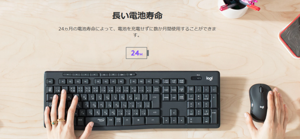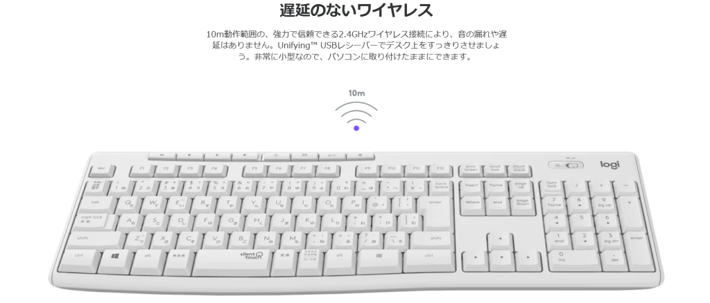 キーボードとマウスはセットで2つに1つのレシーバーに対応しているということです。大体キーボードとマウスで接続端子は分かれますが、このロジクールのキーボードの場合2つセットのためすごく利便性があってよい製品です。また、静穏設計にもなっているのでタイピング音が好きでない、気になってしまうなどの不安も解消して使える製品でもあります。